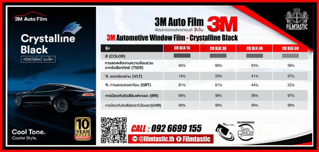ฟิล์มกรองแสงรถยนต์ 3M Crystalline Black รุ่นใหม่ ล้ำด้วยเทคโนโลยีขั้นสูง โทนสีเทาดำพรีเมียม กันร้อนสูง มองชัด ลดแสงสะท้อน และไม่รบกวนสัญญาณอิเล็กทรอนิกส์